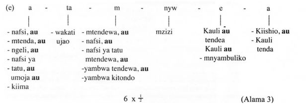 e)Kila ubeti una mistari minne.Mistari mitaru ya kwanza ina viapande vitatu ilhali wa nne una kipande kimoja.Vina katika kila ldpande vinabadilika kutoka ubcti mmoja hadi mwingine.Kiishio kimefupishwa.Kila mstari una mizani 20 isipokuwa kiishio chenye mizani 8.Shairi lina beti 5.