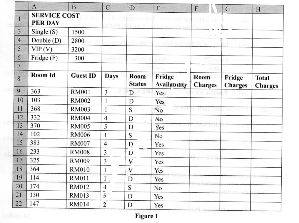 (ii) Create a column bar chart that compares the Room Charges and Fridge Charges for guests whose Guest Id are RM003, RM006 and RM0I2. (4 marks)