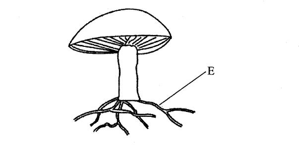 ii. State two functions of the part labelled E.(2 marks)Secretes digestive enzymes(for external digestion);Anchors the organism/mushroom (firmly) onto the substrate. Acc. anchorage.Absorbs digested food materials/Absorbs water and mineral salts/ions.