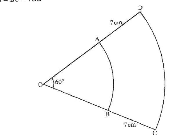 10. In the figure below, AB and CD are arcs of two concentric circles, centre O. Angle AOB = 60° and AD=BC=7cm.